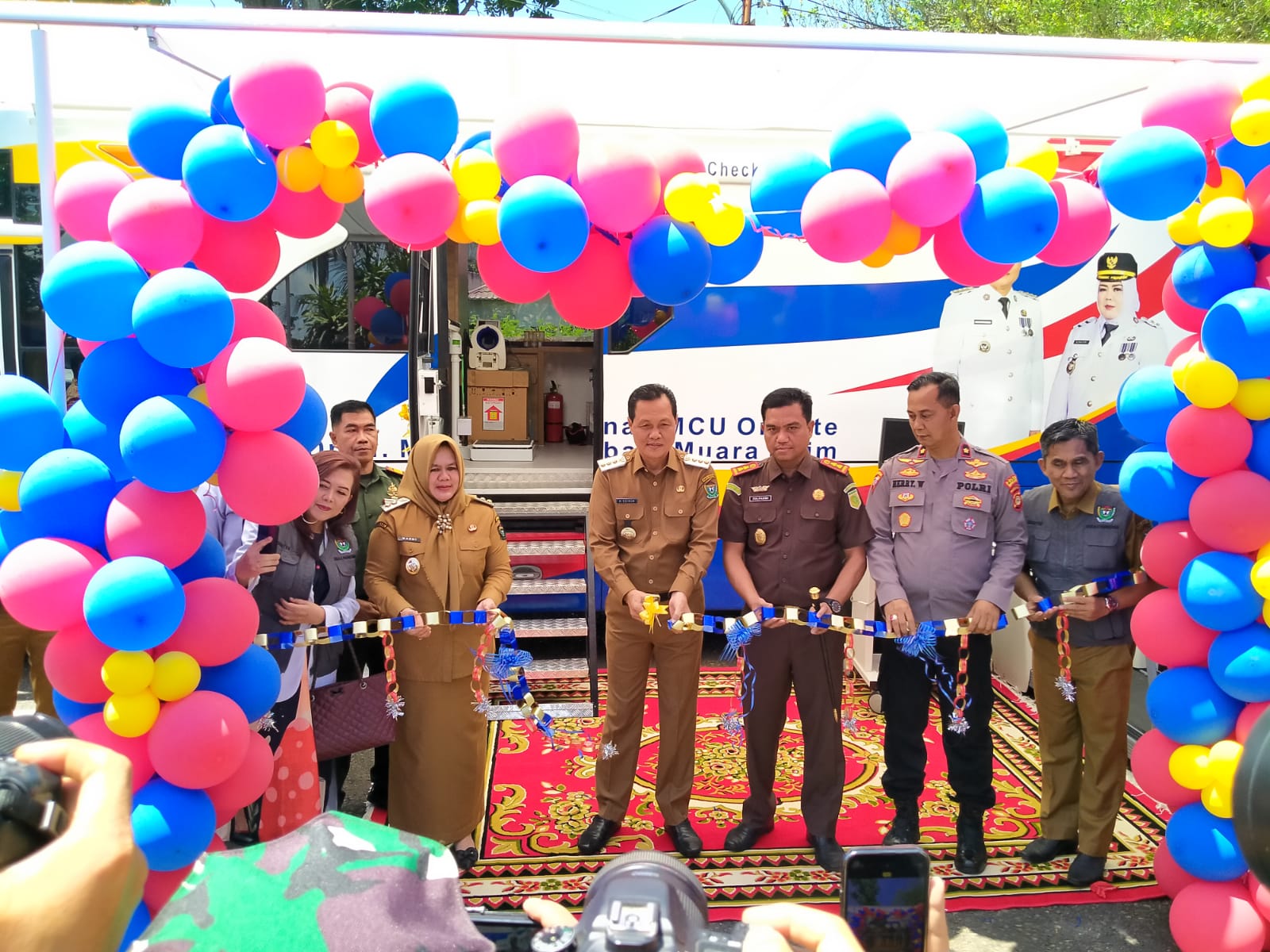 MUARA ENIM, ENIMEKSPRES.CO.ID - Bupati Muara Enim H. Edison, S.H., M.Hum didampingi Wakil Bupati Ir. Hj. Sumarni, M.Si, meluncurkan mobil MCU Rabain MEMBARA milik RSUD Dr. H. Mohamad Rabain.