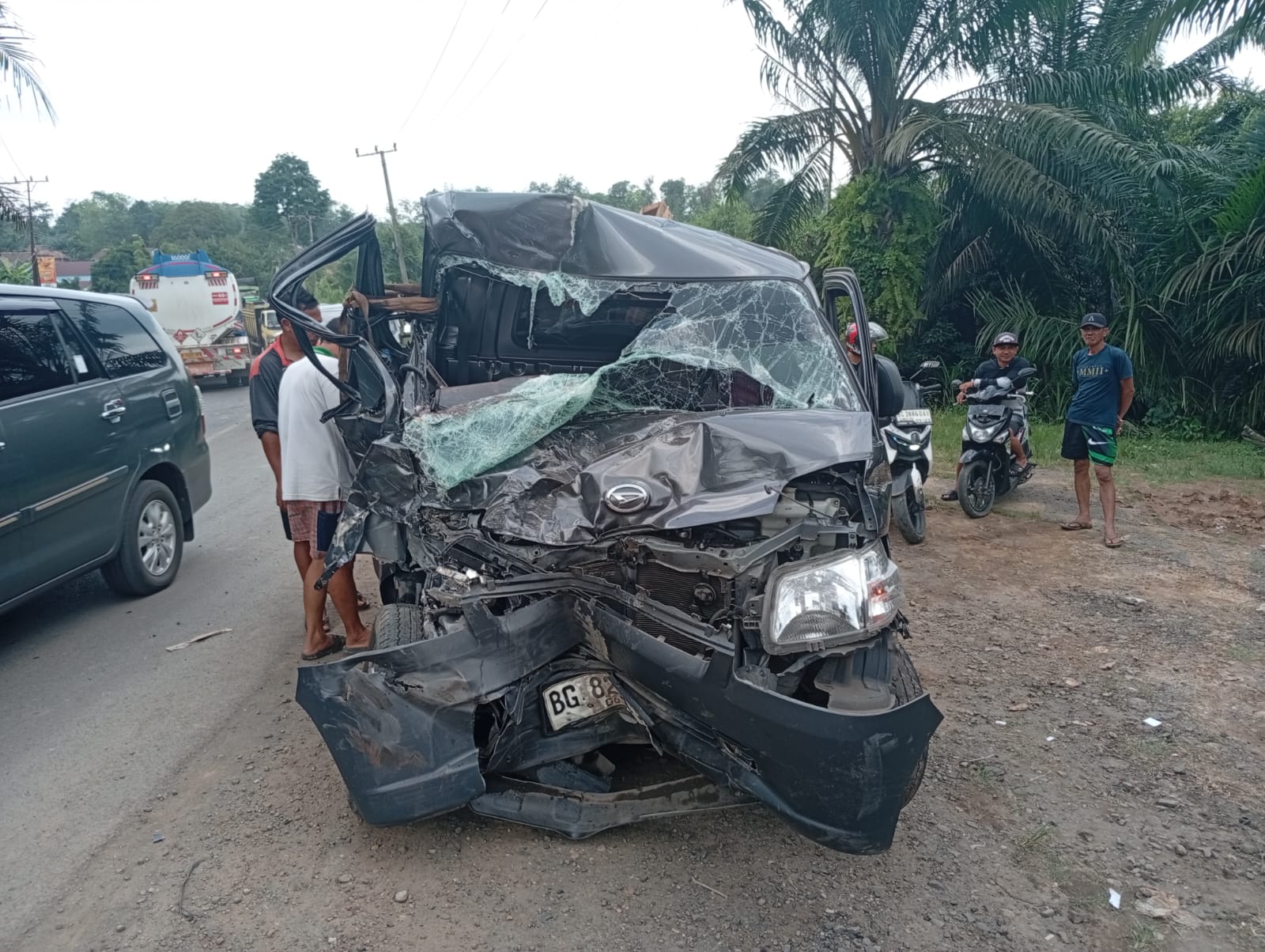 Mobil pickup Daihatsu Grand Max berwarna hitam dengan nomor polisi BG 8261 OM yang dikemudikan Untung Riansyah (40), warga Komplek Taman Indah Blok EH No 2 Talang Kelapa Palembang, menabrak truk trailer B 9827 FJ yang dikemudian Ebit (29), warga Perum Griya Lestari Abadi Blok F No 4 Sungai Selincah Kalidoni Palembang.