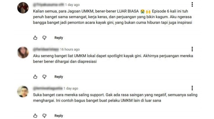 Banyak penonton mengaku terinspirasi oleh semangat dan keteguhan para pengusaha UMKM yang menghadirkan kisah perjuangan nyata penuh emosi dan motivasi, terlihat dari kolom komentar YouTube Shopee Indonesia yang dipenuhi ungkapan dukungan dan apresiasi dari netizen.