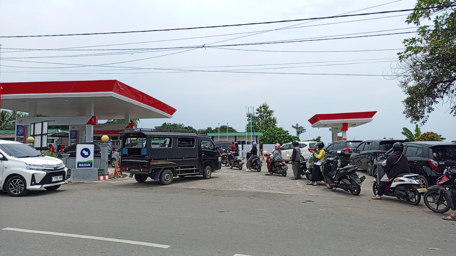 Antrean panjang kendaraan roda 2 dan roda 4 di SPBU SPBU 24.313.43 Talang Jawa Muara Enim. Foto : OZI/ENIMEKSPRES.CO.ID--